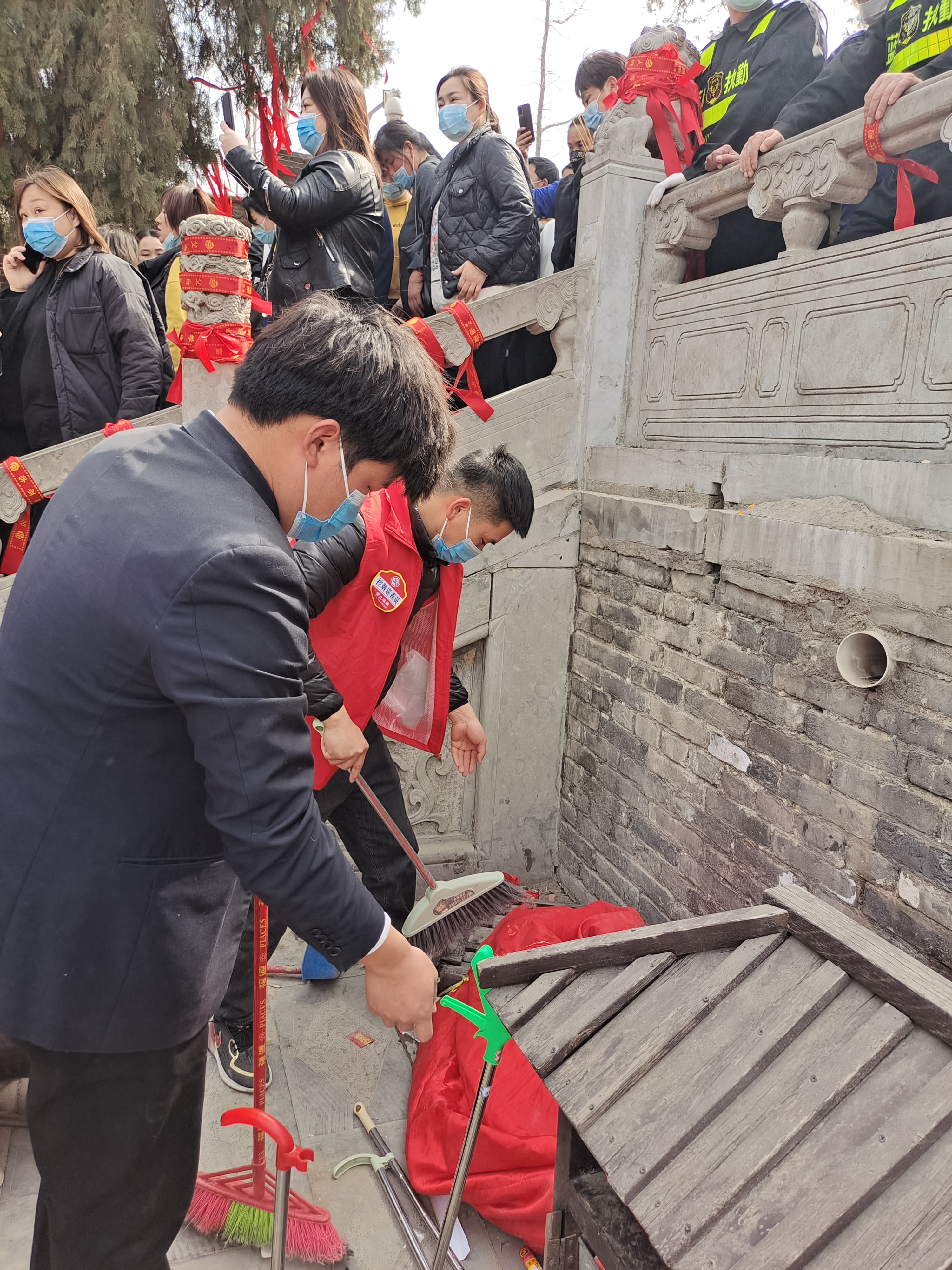 在伏羲陵墓后的蓍草園周圍,有人買紅布條系在欄桿上祈福,有人虔心祝禱。當(dāng)蓍草成為聚焦點(diǎn)時(shí),有人卻拿著打掃工具默默清理垃圾,讓蓍草園成為一方“凈土”。見他們身穿紅馬甲,記者上前詢問,原來是來自建業(yè)物業(yè)的志愿者,其中一名叫李小宇,他說太昊陵已經(jīng)成為淮陽門面,要做好衛(wèi)生,把太昊陵的良好形象維持住?!拔覀兌际亲栽盖皝恚尲亦l(xiāng)父老不論啥時(shí)候都看到一個(gè)干干凈凈的太昊陵!”李小宇說。