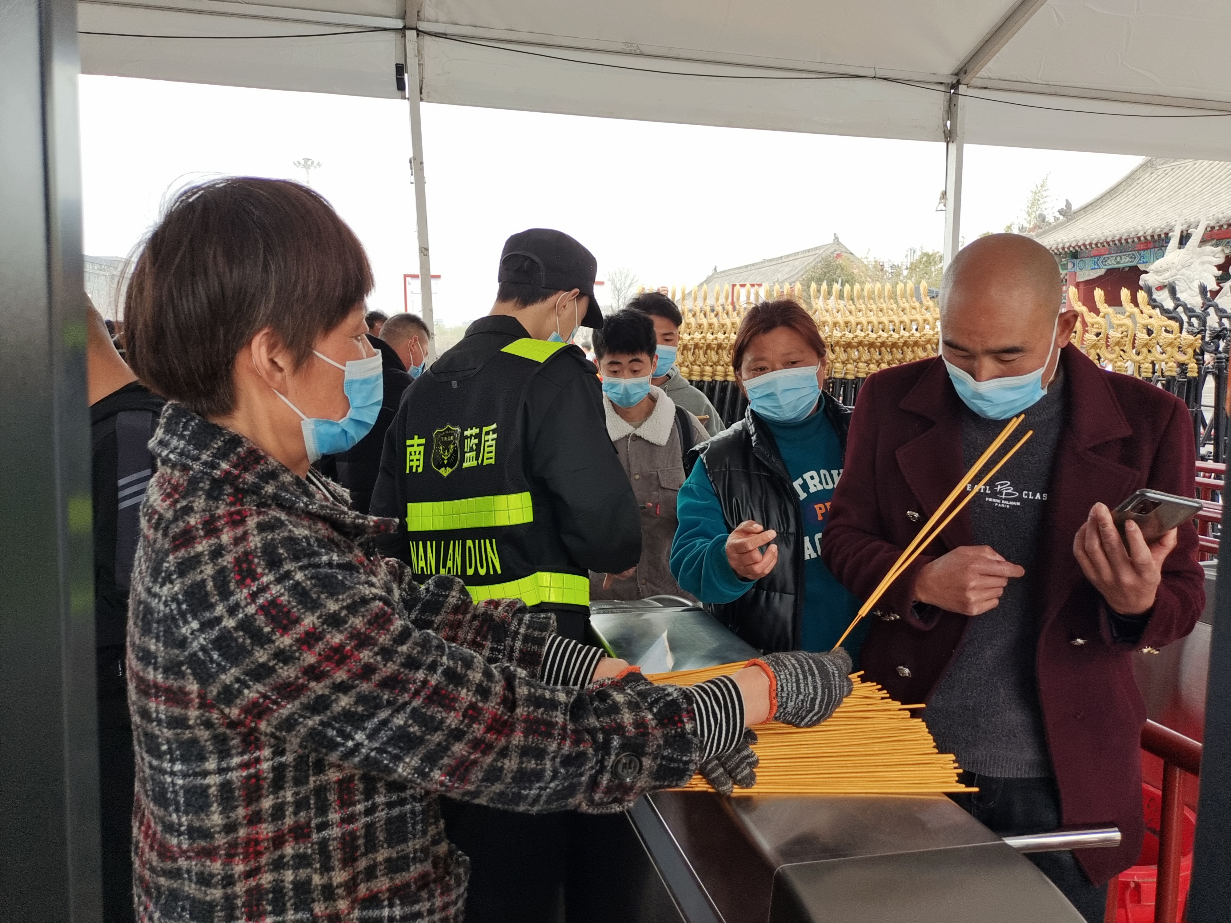“這是您的祈福香,請拿好。”太昊陵的每個(gè)入口,既有專人檢查私自帶香行為,也有工作人員為游客免費(fèi)發(fā)放線香。家住淮陽區(qū)的李姐是其中一員,她早上5時(shí)30分就到達(dá)景區(qū),領(lǐng)取線香并整理,方便為游客發(fā)放?!爸灰€有游客來,我們就不休息,要把祈福的心愿送到他們手中,并引導(dǎo)他們文明燒香、文明祭祀?!崩罱阏f。