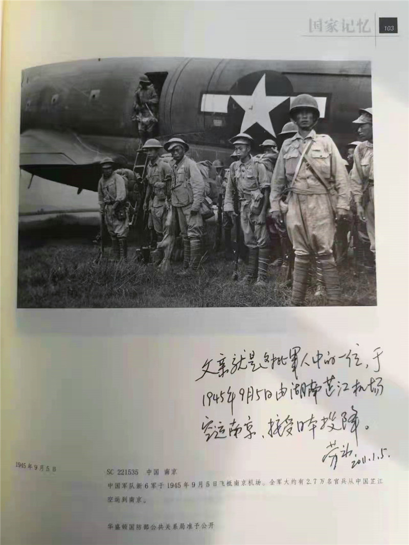 1945年3月,父親隨干訓(xùn)團(tuán)空運(yùn)回國(guó),駐扎云南曲靖,繼續(xù)訓(xùn)練、待命。1945年8月15日,日本投降。干訓(xùn)團(tuán)全體官兵乘汽車到達(dá)湖南芷江機(jī)場(chǎng)(插圖5),再空運(yùn)到南京,參加南京日本受降儀式(插圖6) 。