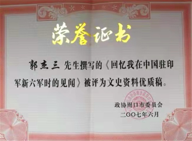 2005年9月3日,時(shí)任中共中央總書(shū)記、國(guó)家主席、中央軍委主席胡錦濤發(fā)表了《在紀(jì)念中國(guó)人民抗日戰(zhàn)爭(zhēng)暨世界反法西斯戰(zhàn)爭(zhēng)勝利60周年大會(huì)上的講話》,正視了正面戰(zhàn)場(chǎng)國(guó)民黨軍隊(duì)抗戰(zhàn)的歷史。之后,父親才給我講述他遠(yuǎn)征抗日的經(jīng)歷,并撰寫(xiě)了《回憶我在中國(guó)駐印軍新六軍時(shí)的見(jiàn)聞》一稿,刊登在2007年《周口文史資料》上。政協(xié)為表彰父親的貢獻(xiàn),特別頒發(fā)了“文史資料優(yōu)質(zhì)稿”獎(jiǎng)狀。