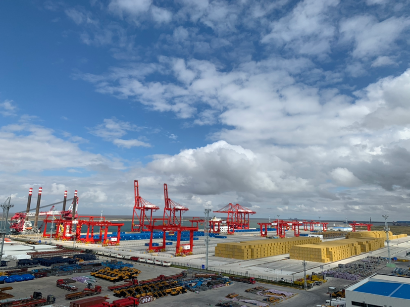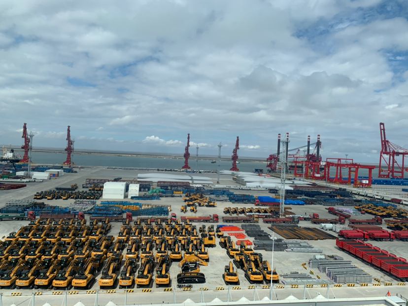 由于疫情防控的原因,記者沒能進(jìn)入港口核心區(qū),只能站在港口辦公大樓樓頂遠(yuǎn)眺港口。站在樓頂,港口景觀盡收眼底——挖掘機(jī)和風(fēng)機(jī)葉片被“碼”的整整齊齊,正待裝船出口;機(jī)器不停運(yùn)轉(zhuǎn),給??康拇谎b卸貨物;重型貨柜車進(jìn)出有序、川流不息。而令人驚奇的是,諾大的港口空無一人。