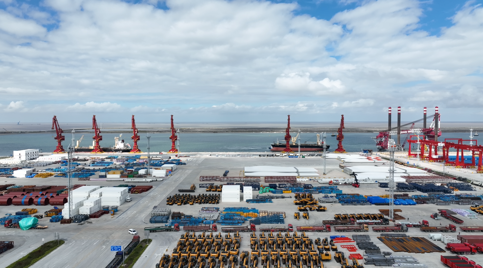 站在呂四起步港港區(qū)綜合樓的最高處,極目遠(yuǎn)眺,港口景觀盡收眼底。港池父親般寬闊的臂膀,將一艘艘越洋而來的萬噸巨輪攬入懷中;挖掘機(jī)和風(fēng)機(jī)葉片被“碼”得整整齊齊,正待裝船出口;機(jī)器不停運(yùn)轉(zhuǎn),給??康拇谎b卸貨物;重型貨柜車進(jìn)出有序、川流不息。而令人驚奇的是,偌大的港口幾乎沒有看到一個(gè)工作人員。