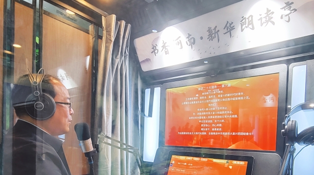 11月3日,在位于項城市商城路與西大街交叉口的新華書店朗讀亭內(nèi),誦讀愛好者年秋燕正在選讀黨的二十大報告原文,其深情且鏗鏘有力的誦讀聲令人如癡如醉。