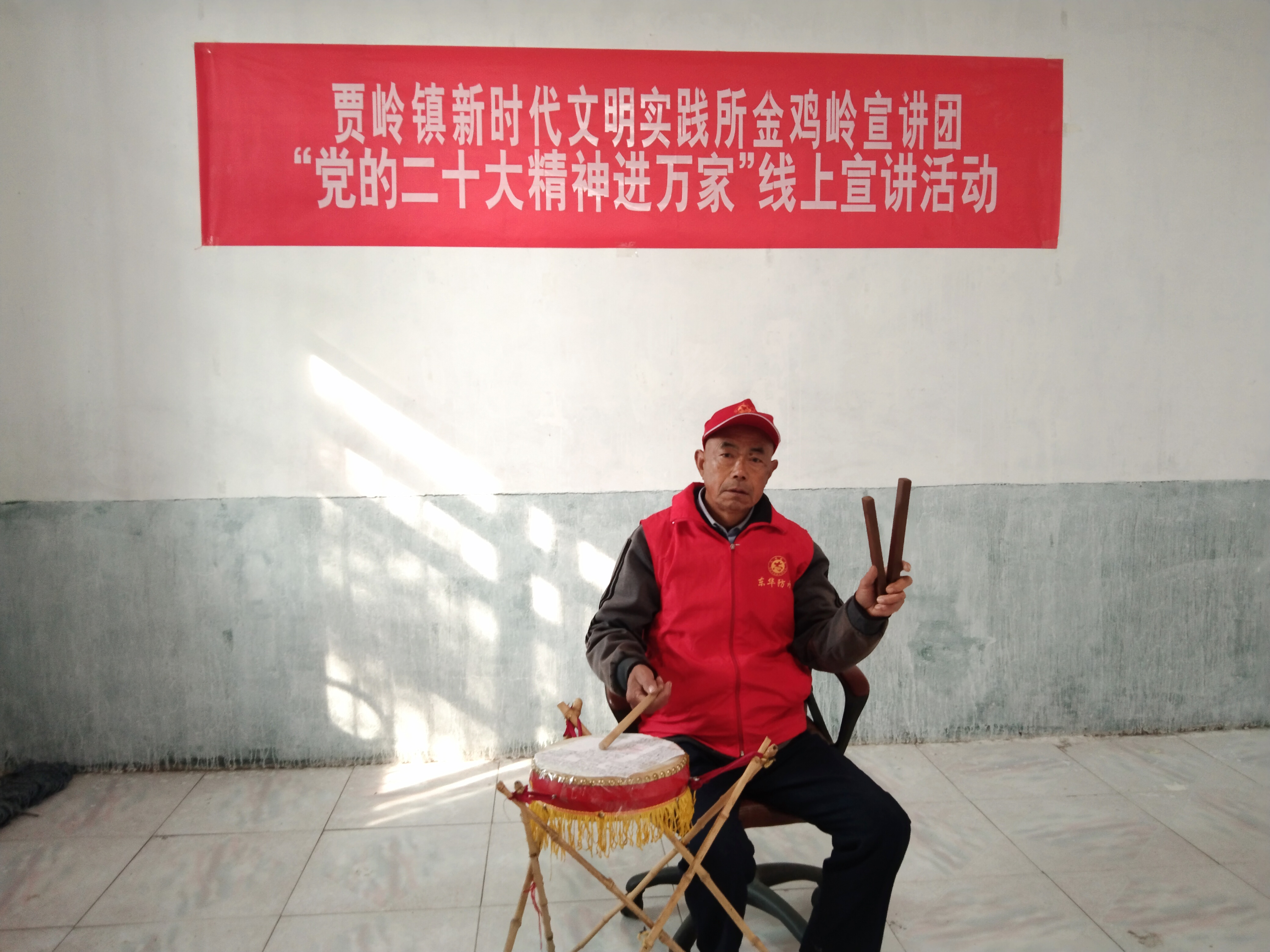 近日,項城市賈嶺鎮(zhèn)新時代文明實踐所金雞嶺宣講團志愿者、七旬老人閆汝才閑暇就會坐在一張凳子上,一手敲鼓、一手夾板,配合唱腔、道白,利用非遺“大鼓書”藝術(shù)表演形式,通過抖音平臺在線上宣傳黨的二十大精神。