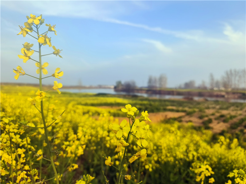 4月2日,春日明媚,沙潁河兩岸一片片金燦燦的油菜花“染黃”了大地,空氣中彌漫著香氣,大片的油菜花和漂亮的村居、田間勞作的農(nóng)民交織在一起,如詩(shī)如畫(huà),美不勝收,讓人心曠神怡。