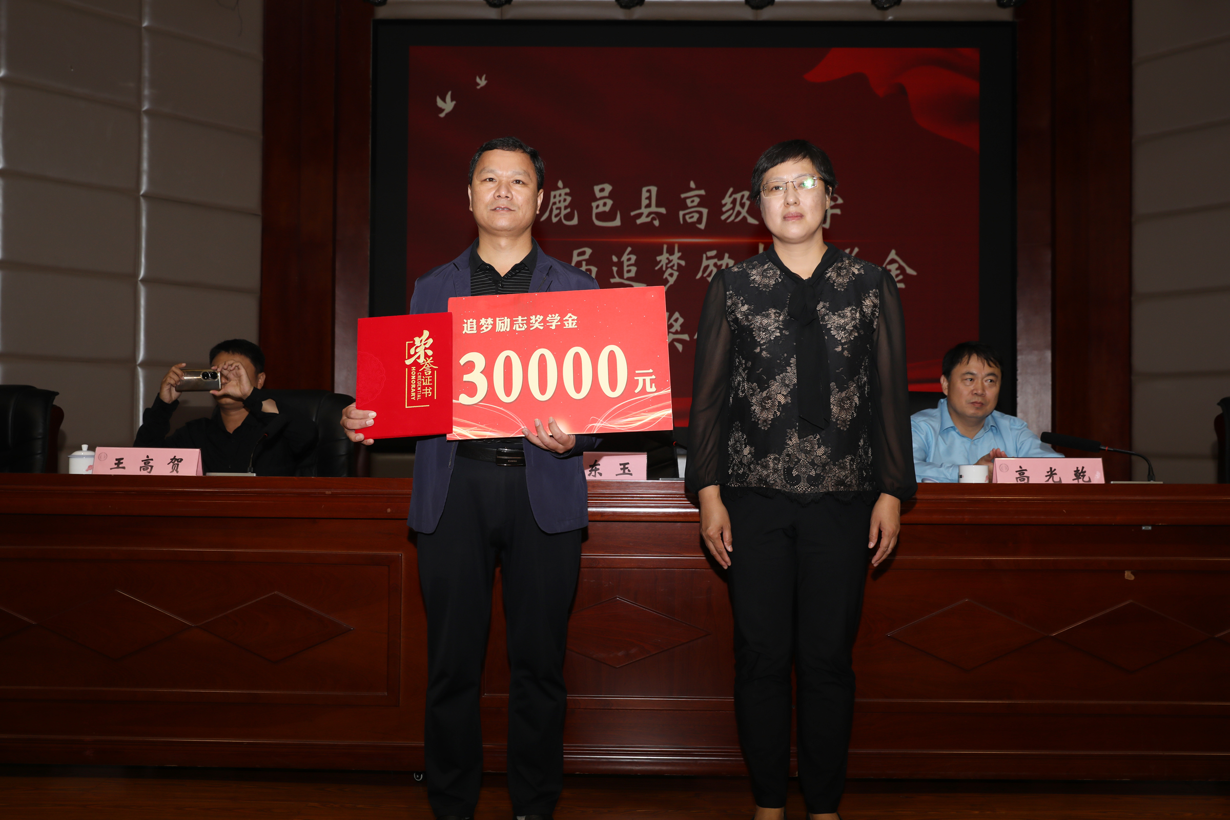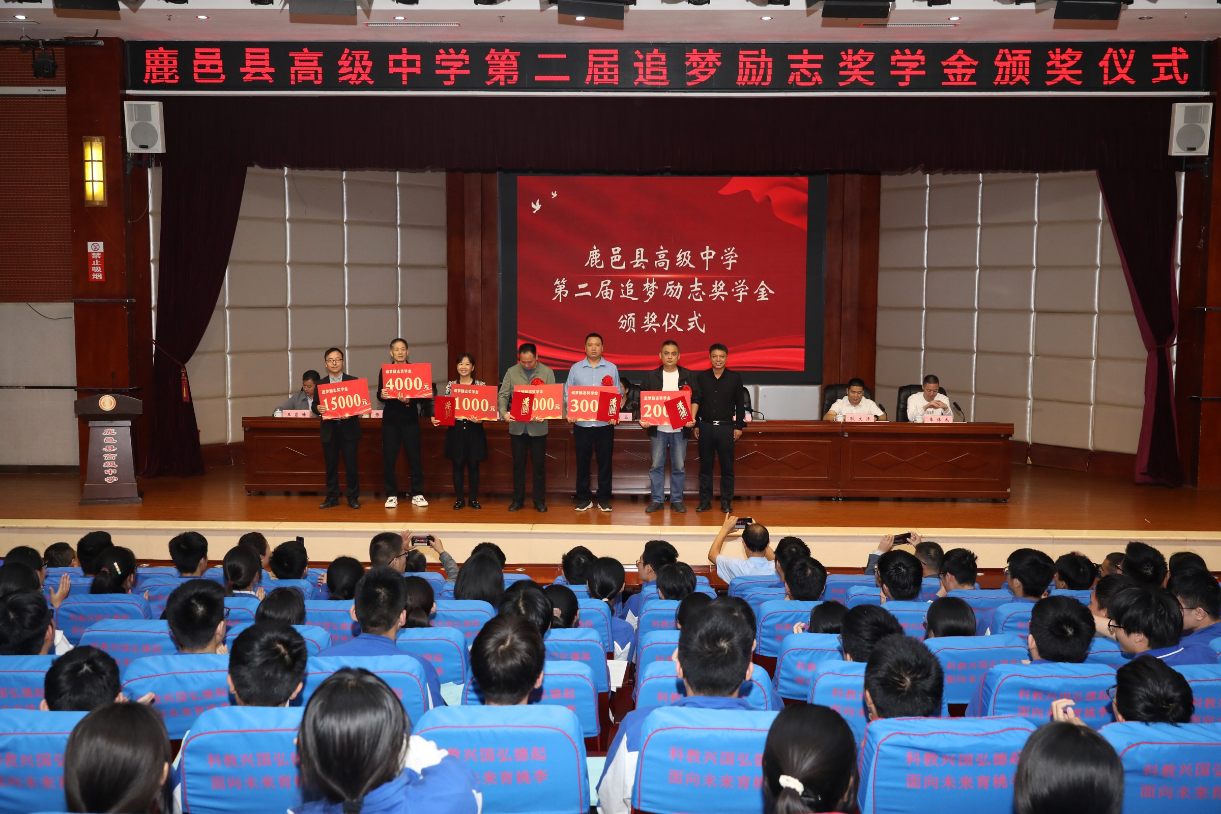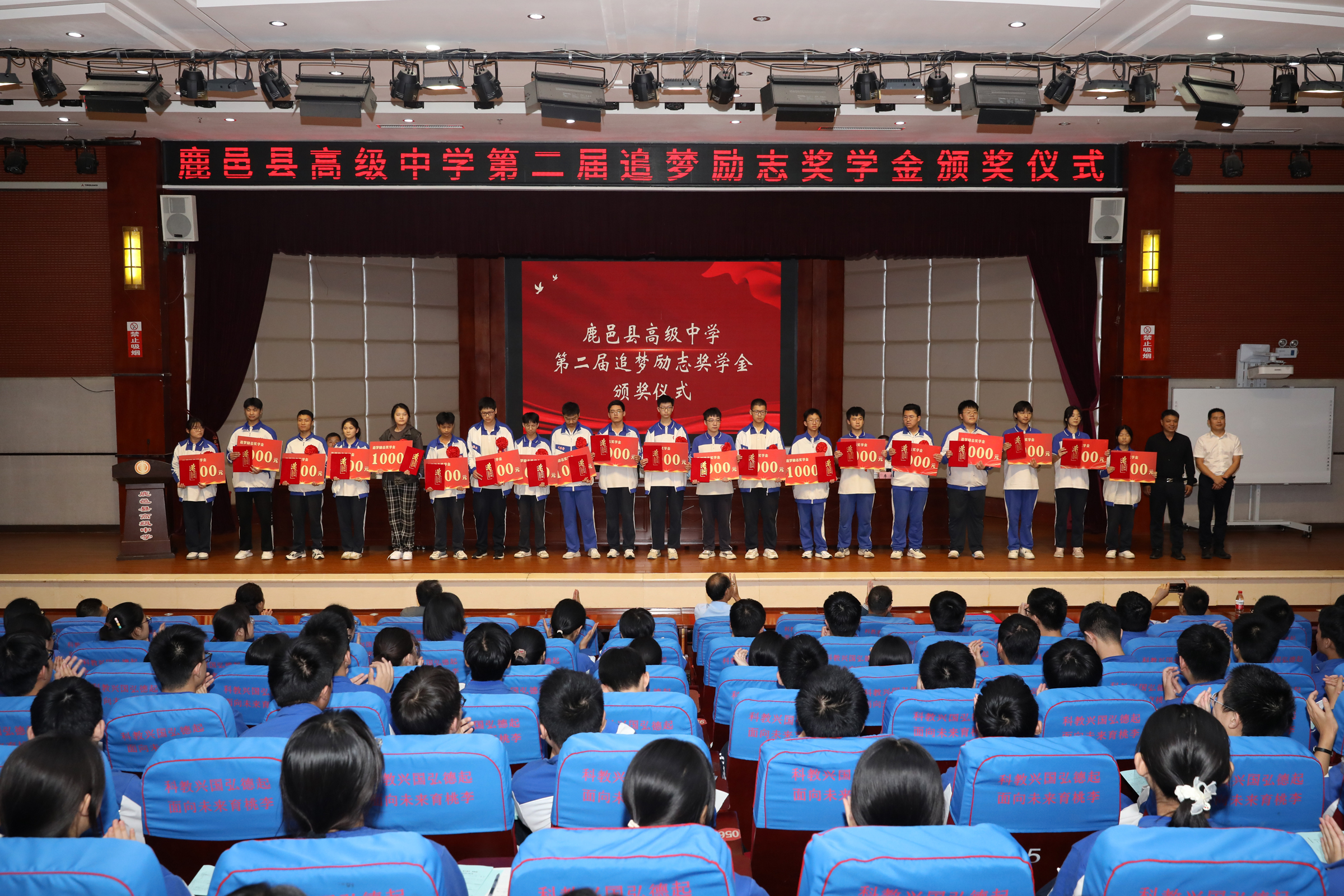 據(jù)了解,鹿邑縣高級中學(xué)追夢勵志獎學(xué)金是2022年由優(yōu)秀校友、暨南大學(xué)教授王高賀發(fā)起,部分校友和社會愛心人士自愿捐贈資金,在學(xué)校設(shè)立的勵志獎學(xué)金,用于獎勵母校優(yōu)秀的學(xué)生和教師團(tuán)隊(duì)。此次頒獎儀式共頒發(fā)獎學(xué)金11萬元,周樂樂、張逍遙等40位同學(xué)和高小飛、毛東方等6個班級教師團(tuán)隊(duì)獲得追夢勵志獎學(xué)金。在2023年高考中,陳孟康同學(xué)被北京大學(xué)飛行員班錄取,北清部全體教師獲得3萬元名校獎。