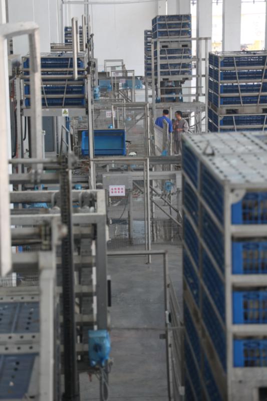 宰雞第一步先消毒,一筐筐自動分好的白羽活雞上架后即得到?jīng)_洗,“干干凈凈”地進(jìn)入下一程序——掛雞。步驟與步驟銜接中的自動化程度很高,掛雞室光線略暗。“我們采用國際化標(biāo)準(zhǔn),宰殺環(huán)節(jié)在暗室進(jìn)行?!毕嚓P(guān)人員說。