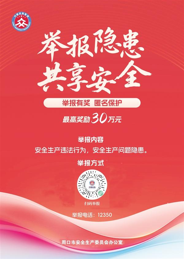 周口市安全生產(chǎn)委員會辦公室以舉報(bào)電話、掃碼舉報(bào)等方式,受理群眾舉報(bào)安全生產(chǎn)非法違法行為線索。一經(jīng)查實(shí),我們將依據(jù)《河南省安全生產(chǎn)領(lǐng)域舉報(bào)獎(jiǎng)勵(lì)實(shí)施辦法》相關(guān)規(guī)定,對舉報(bào)人予以獎(jiǎng)勵(lì),最高獎(jiǎng)勵(lì)金額30萬元。我們將對舉報(bào)人個(gè)人信息進(jìn)行嚴(yán)格保密,依法保護(hù)舉報(bào)人的合法權(quán)益。