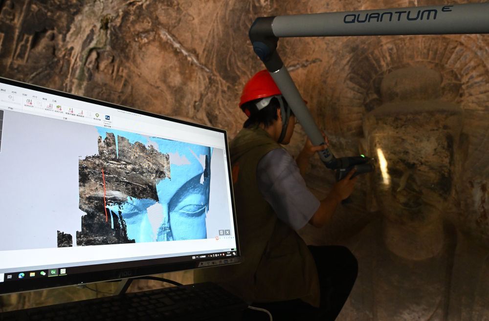 2025年4月9日,武漢大學(xué)文化遺產(chǎn)智能計算實驗室團隊成員在魏字洞使用關(guān)節(jié)臂掃描儀對佛像進(jìn)行數(shù)字化掃描。圖片來源新華社