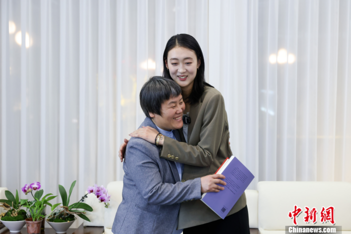 中新社記者采訪后擁抱李翠利。楊郁然 攝
