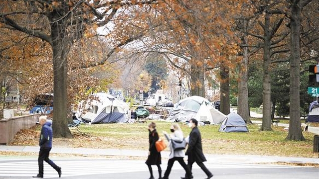 12月8日,在美國華盛頓,行人經(jīng)過無家可歸者居住的帳篷?!?a href="http://www.40max.com/content/2021-12/11/content_962080.html" target="_blank" >[詳細(xì)]