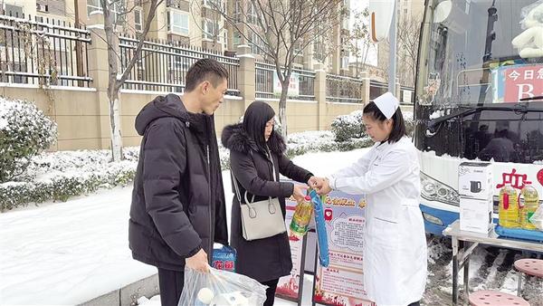 1月19日,熱心市民冒雪步行到獻血車無償獻血,以熱血守護生命。圖為市民獻血后領(lǐng)取無償獻血紀(jì)念品。