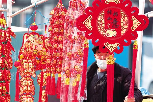 2月5日,商水縣固墻鎮(zhèn)街頭,紅紅火火的年貨攤位一字排開(kāi),大紅的春聯(lián)、福字等商品琳瑯滿目。圖為群眾在挑選心儀的年貨。