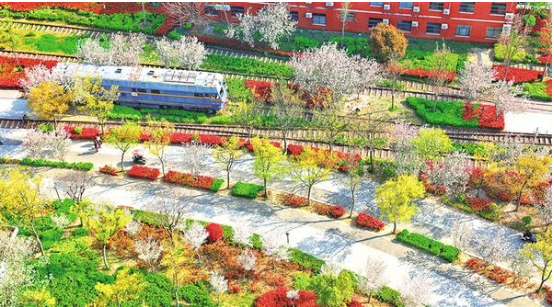 3月28日,周口市鐵路公園內,春日盛景如約而至。老鐵軌蜿蜒向前,藍皮火車承載著歲月印記,與盛放的白花、明艷的灌木相映成趣。