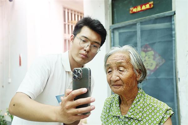 在淮陽區(qū)王店街道祝寨村,返鄉(xiāng)大學生周宏領(lǐng)為老人完善身份信息。近日,淮陽區(qū)開展80歲以上老人津貼系統(tǒng)信息更新工作,為確保政策精準落實,老人需提供最新身份信息。