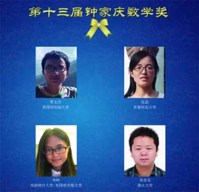 中國(guó)數(shù)學(xué)會(huì)21日揭曉了第十三屆華羅庚數(shù)學(xué)獎(jiǎng)、第十六屆陳省身數(shù)學(xué)獎(jiǎng)和第十三屆鐘家慶數(shù)學(xué)獎(jiǎng)的獲獎(jiǎng)名單。今年獲得鐘家慶數(shù)學(xué)獎(jiǎng)的分別是美國(guó)斯坦福大學(xué)的樊玉偉(來(lái)自河南周口)、首都師范大學(xué)的張蕊、西南財(cái)經(jīng)大學(xué)和美國(guó)密西根大學(xué)的周嶺、浙江大學(xué)的周青龍等4名博士生?!?a href="http://www.40max.com/content/2017-10/23/content_581562.htm" target="_blank" >[詳細(xì)]