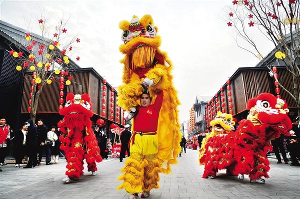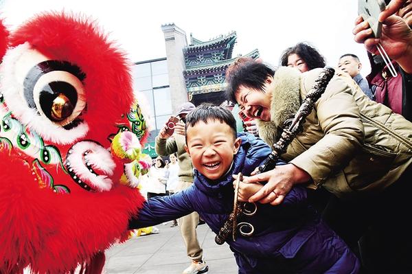 1月22日,孩子和“獅子”親密接觸,既開心又緊張。當日,隨著第二屆“三川十館·春會”開幕,處處洋溢著歡快的新年氛圍。