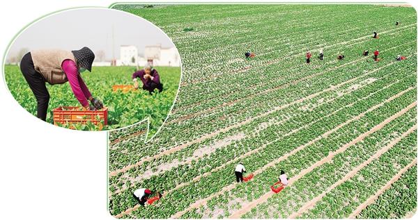 近年來,我市積極推廣“合作社+農戶”“家庭農場+農戶”經營模式,鼓勵農民通過土地流轉將分散耕地整合起來,實現集中化、規(guī)模化經營,全力提高土地利用效率,為鄉(xiāng)村振興注入強勁動力。圖為4月11日,在淮陽區(qū)王店街道范莊行政村的農田里,村民正采收蔬菜。