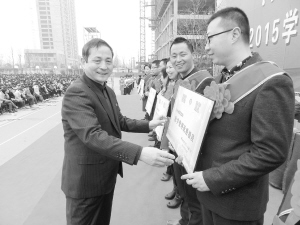 3月8日上午,淮陽(yáng)一高萬(wàn)余名師生在學(xué)校操場(chǎng)隆重舉行新學(xué)期表彰大會(huì)。大會(huì)回顧了2014~2015學(xué)年第一學(xué)期的各項(xiàng)工作,對(duì)感動(dòng)校園學(xué)生、優(yōu)秀班主任、優(yōu)秀員工、優(yōu)質(zhì)課教師等24個(gè)項(xiàng)目近500人次進(jìn)行了表彰?;搓?yáng)縣有關(guān)領(lǐng)導(dǎo)及淮陽(yáng)一高全體師生參加了本次表彰大會(huì)。圖為王業(yè)生校長(zhǎng)為獲獎(jiǎng)人員頒發(fā)獎(jiǎng)狀。(豆紀(jì)鋒 攝)