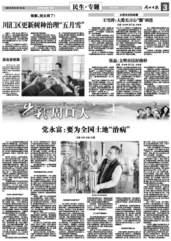 “近年來土壤酸化板結(jié)速度加快,所有土地遭受不同程度的農(nóng)資次生災(zāi)害。建議各級黨委和政府及有關(guān)部門應(yīng)盡早重視土地污染治理工作,牽頭組織相關(guān)部門,爭取盡快在全市范圍內(nèi)宣傳、推廣和應(yīng)用土地污染治理技術(shù),逐步向全國受污染的土地開戰(zhàn),為子孫留下更多的凈土?!秉h永富說,這是他的夢想。