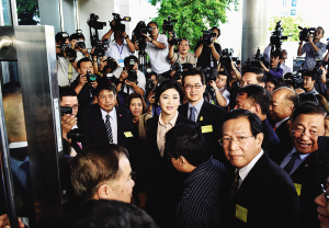 泰國最高法院首次開庭審理英拉“大米案” 5月19日,在泰國曼谷,泰國前總理英拉(中)到達(dá)泰國最高法院出席大米收購案聽證會(huì)。新華社發(fā)