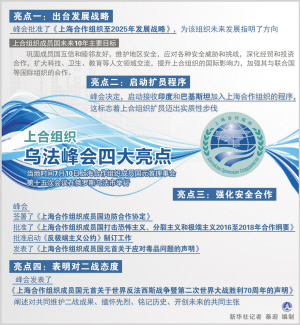 烏法,見證金磚國家新開發(fā)銀行籌備工作全面展開,應(yīng)急儲(chǔ)備安排正式啟動(dòng);見證上合組織成立14年來首次擴(kuò)員,印度和巴基斯坦加入上合組織的程序啟動(dòng),白俄羅斯成為觀察員國,阿塞拜疆、亞美尼亞、柬埔寨、尼泊爾成為對(duì)話伙伴國……新興和發(fā)展中國家伙伴關(guān)系日益密切。