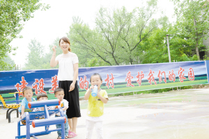 五里廟村村民周振蕾帶著小朋友們?cè)诮∩韽V場(chǎng)上玩耍,臉上充滿喜悅和幸福。