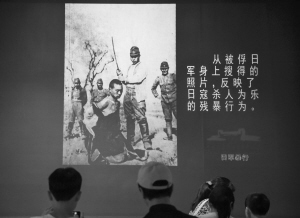 日軍虐待和殘殺戰(zhàn)俘的罪行,也展示在主題展覽中。有一組照片來自美國《生活》雜志,照片顯示日軍軍官先用劍刺殺一名中國戰(zhàn)俘,隨后,日軍士兵用刺刀繼續(xù)進(jìn)行“刺殺練習(xí)”,其殘忍和野蠻令人發(fā)指。