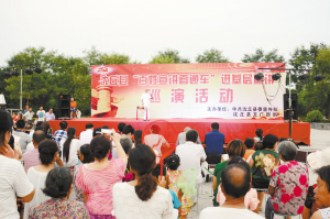 7月13日,沈丘縣“百姓宣講直通車”進(jìn)基層宣講首場演出在該縣中華槐園千字文廣場舉行,舞蹈、戲曲、小品、大鼓書等多樣化的藝術(shù)形式,為前來游玩休閑的市民獻(xiàn)上了一道豐厚的精神大餐,讓大家在娛樂之余,對黨的新理論新政策有了更多的了解。圖為節(jié)目演出現(xiàn)場。(邵永成 攝)