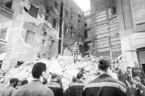 3月11日,在埃及首都開羅,救援人員在樓房倒塌事故現(xiàn)場展開工作。