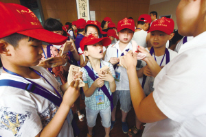 小記者們按照要求學起四指點鈔法,可手指怎么也不聽使喚。銀行的阿姨告訴他們竅門:先將一沓點鈔紙彎成扇形,然后每根手指撥動一張點鈔紙。很快,小記者們就熟練了許多。